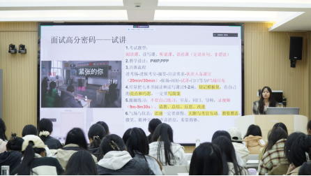 两位学姐分别从心态准备和调整、笔试思维导图的梳理、面试重难点、教案准备技巧、着装规范与礼仪等方面为同学们进行了经验传授和现场讲解。在互动环节中,针对同学们的提问答疑解惑、分享从教以来的心路历程。活动氛围热烈,现场交流互动活跃。